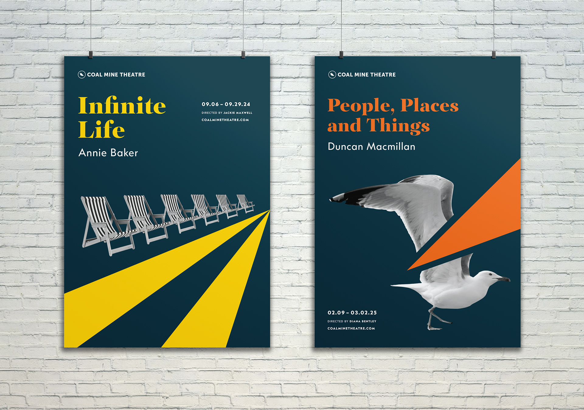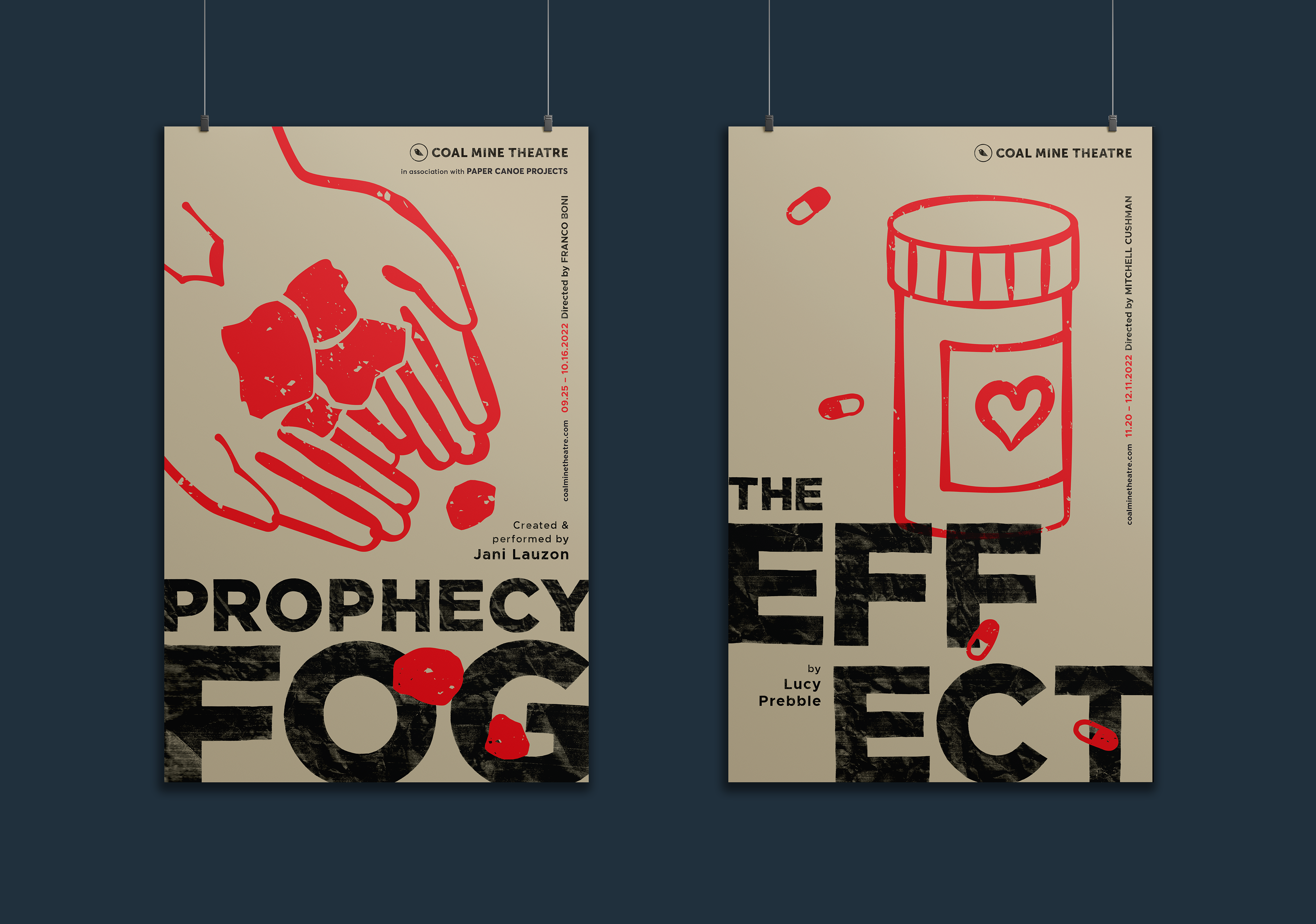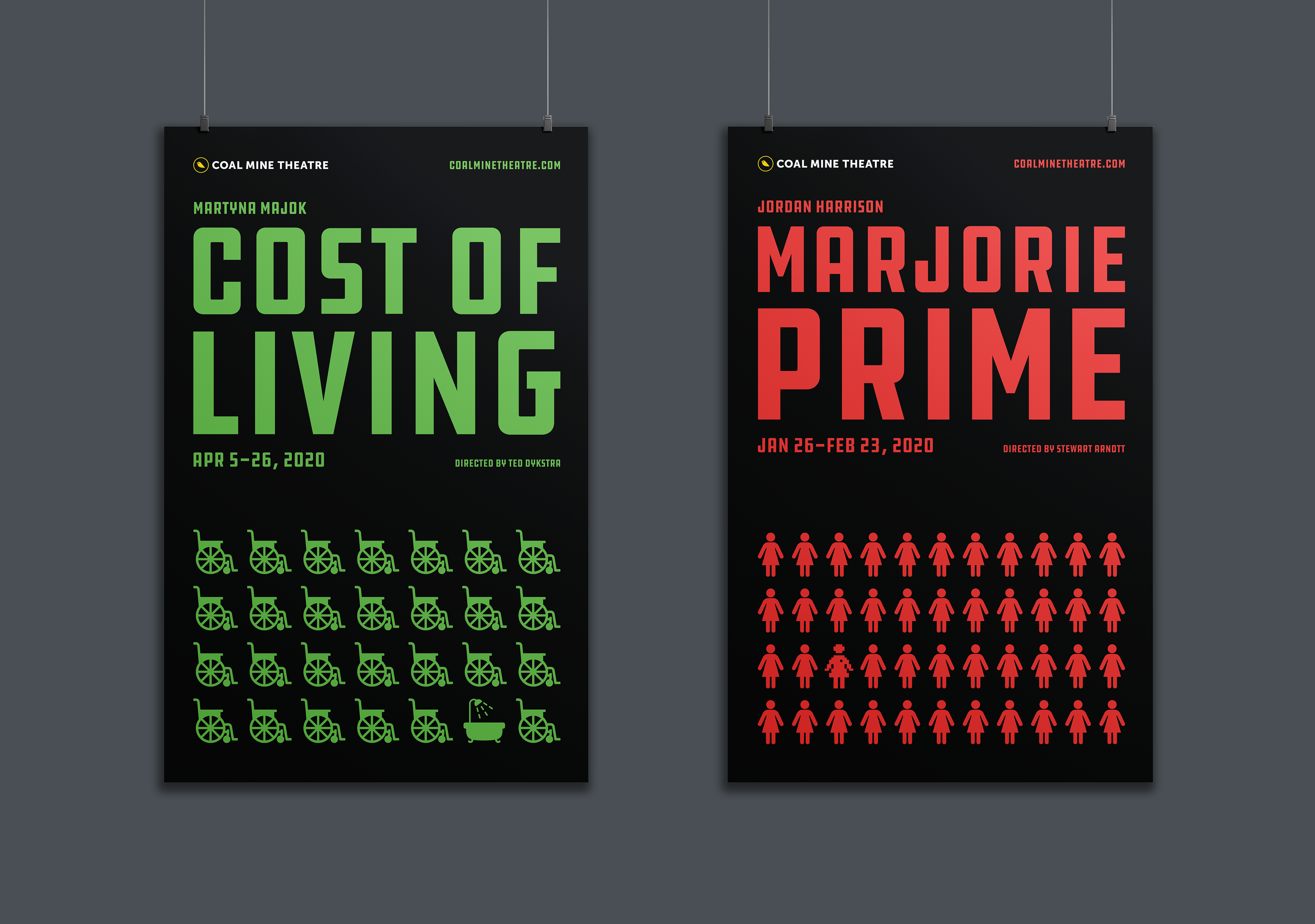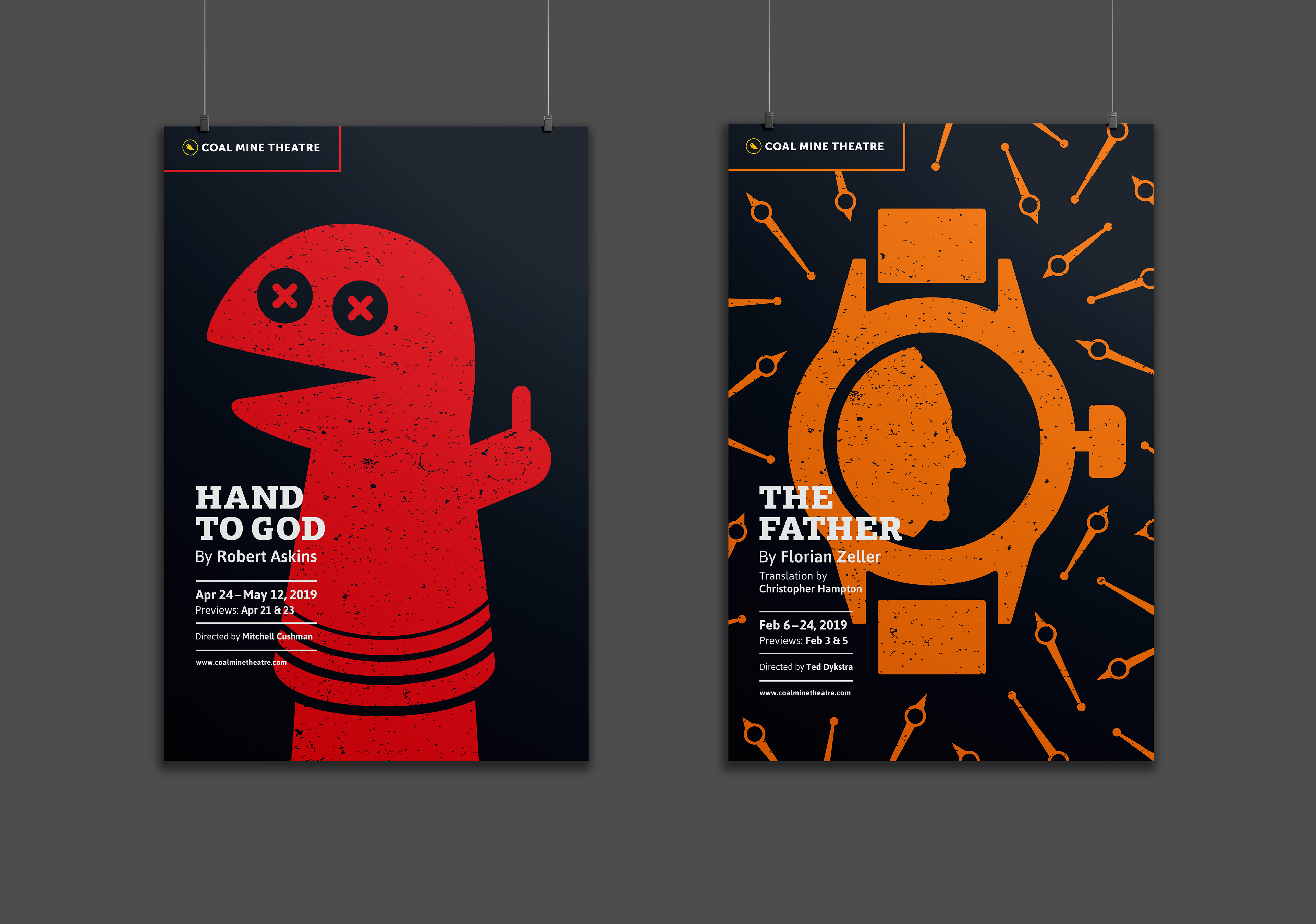 The Coal Mine is an independent theatre in Toronto’s East End. The logo concept is based on an allusion to caged canaries that miners would carry down into the mine tunnels with them. If dangerous gases such as carbon monoxide collected in the mine, the gasses would kill the canary before killing the miners, thus providing a warning to exit the tunnels immediately. Just like a new play the success of which is never certain. Each season's design strives towards a different feeling (dramatic, happy, intense). The illustrations are based on elements of the plays, but never spoiling the story.