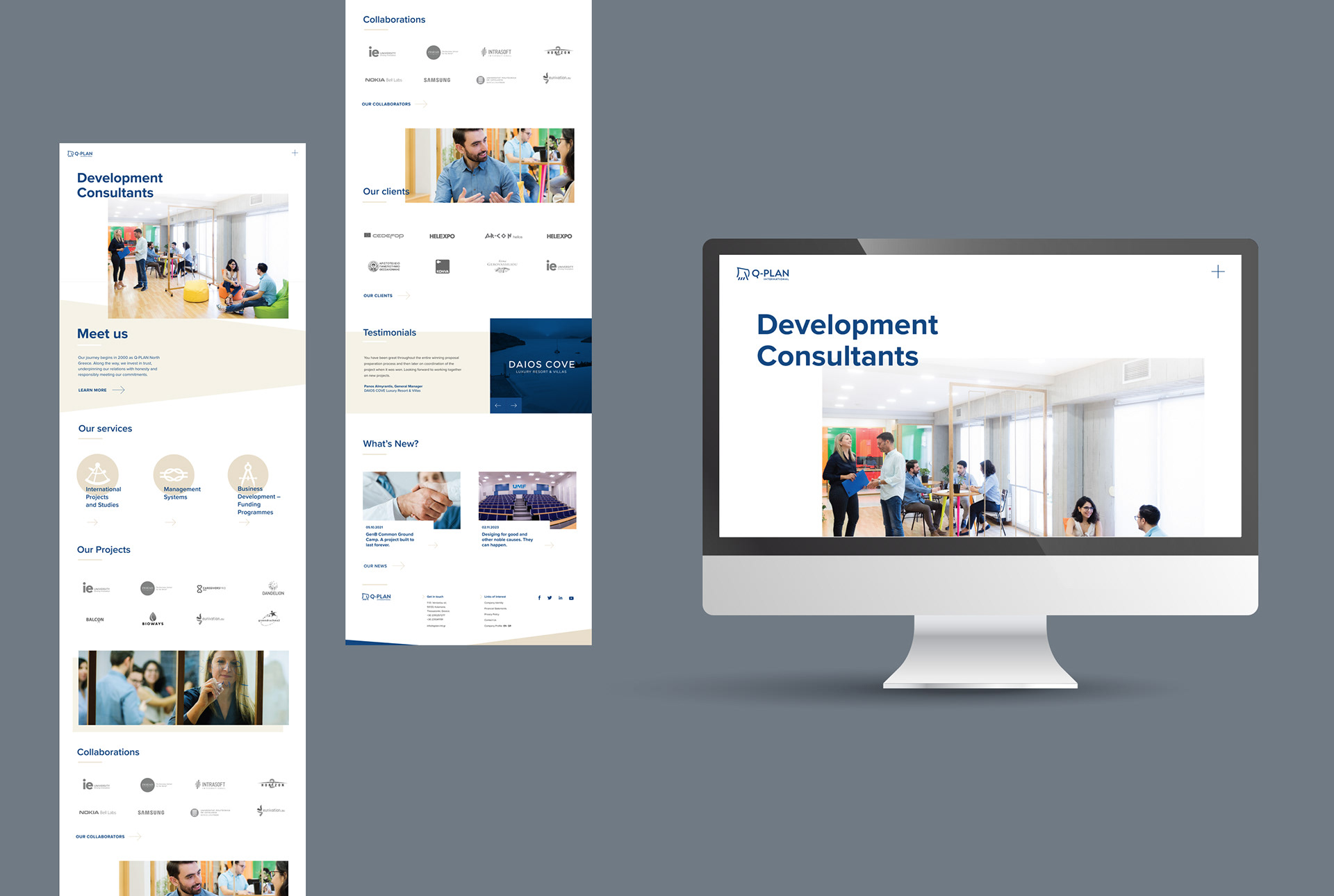 Logo redesign, corporate brochure and website design for Q-Plan International, a company that offers quality expert advice supporting sustainable business and implements high-end research and innovation projects and policy studies. We were asked to redesign and modernize the logo and corporate collateral, while keeping the trireme symbol. We chose to work with clean lines and shapes, colours that correspond to sea and land, plus a set of nautical illustrations. A nod to the constant journey that every company and organisation finds itself in. A CLEAN/CUT project.