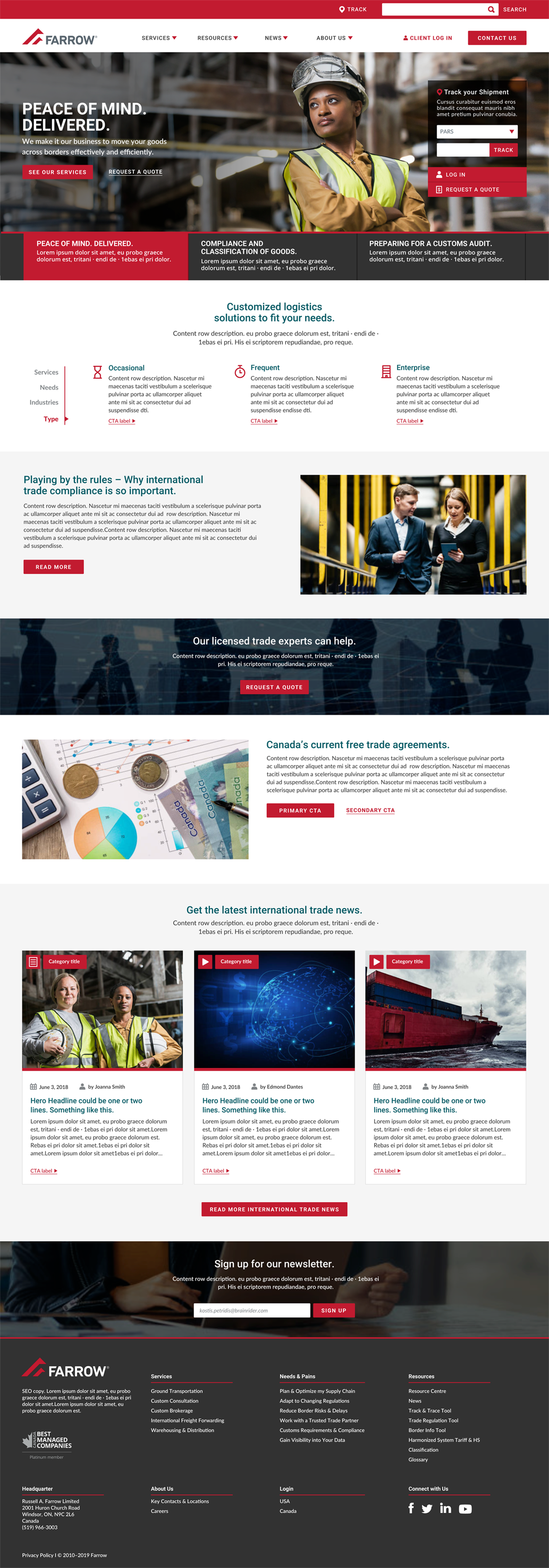 Headquartered in Windsor, Canada, Farrow brings to the global trade industry over 110 years of expertise in cross-border customs brokerage, trade consulting, and integrated logistics services. The goal was to design a website where the user can instantly access their information but also the pleathora of services that Farrow provides, easily navigating through the website.
