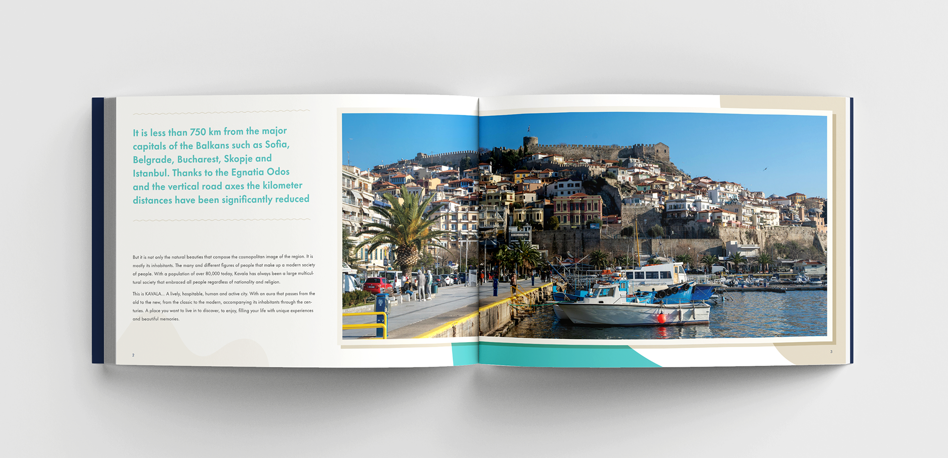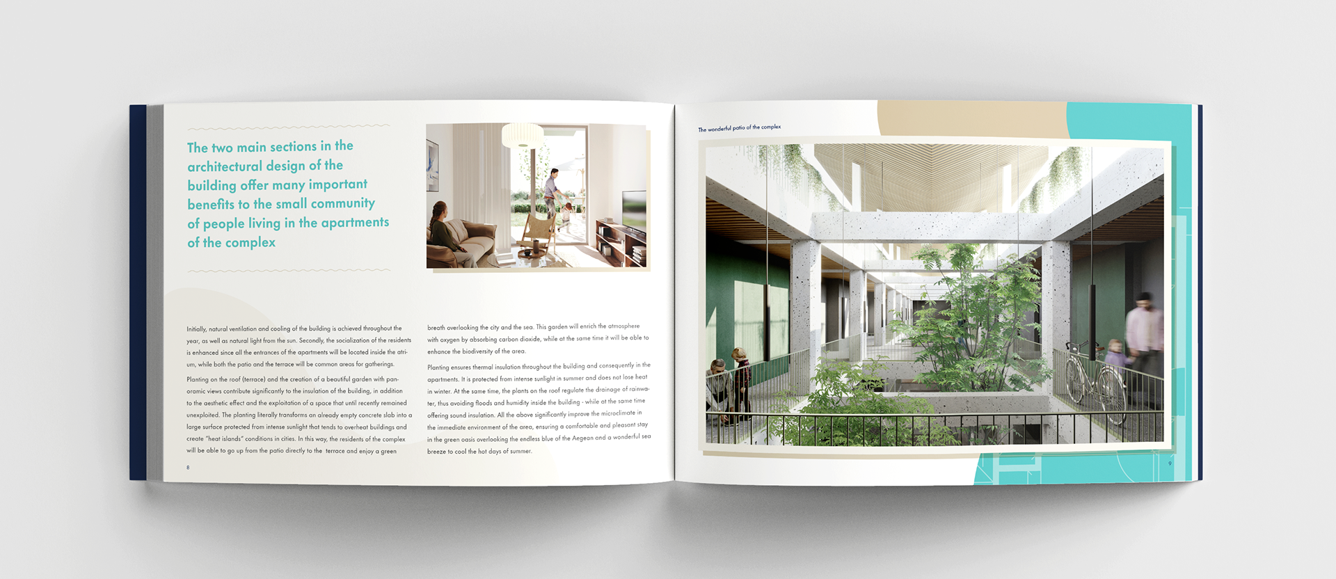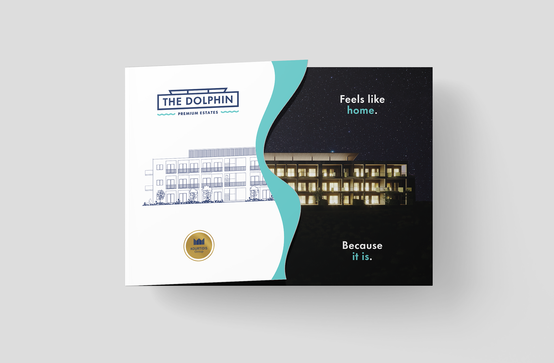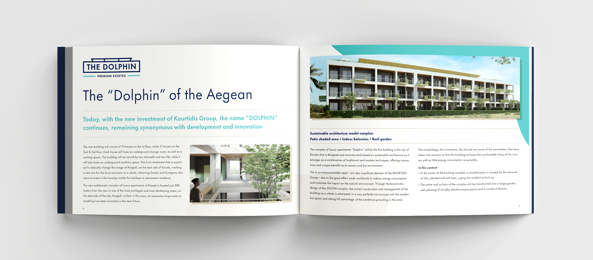 "The Dolphin" is the new ambitious project of Kourtidis Group in the city of Kavala. It is the first building designed and reconstructed based on sustainable architecture, offering innovations and unique benefits to its owners and the environment. The logo is based on the shape of the building and its proximity to the sea. The brochure combines the austere lines of the logo and building with the relaxed waves of the nearby sea of Kavala.